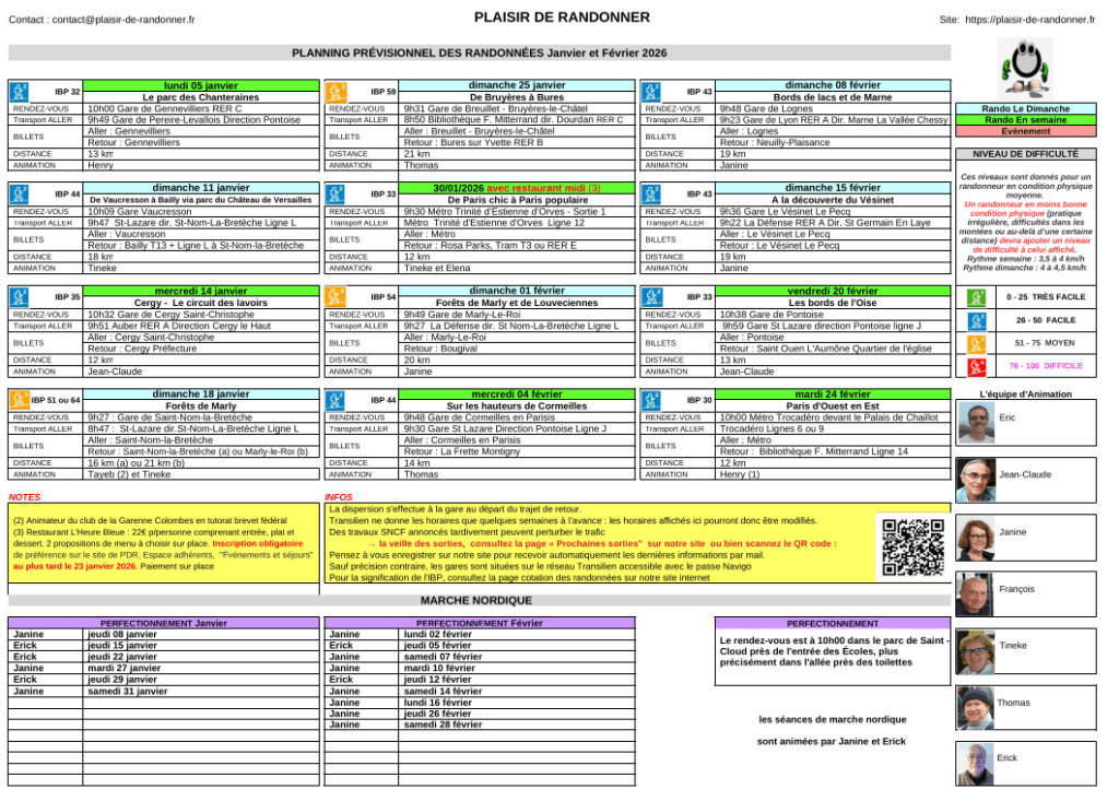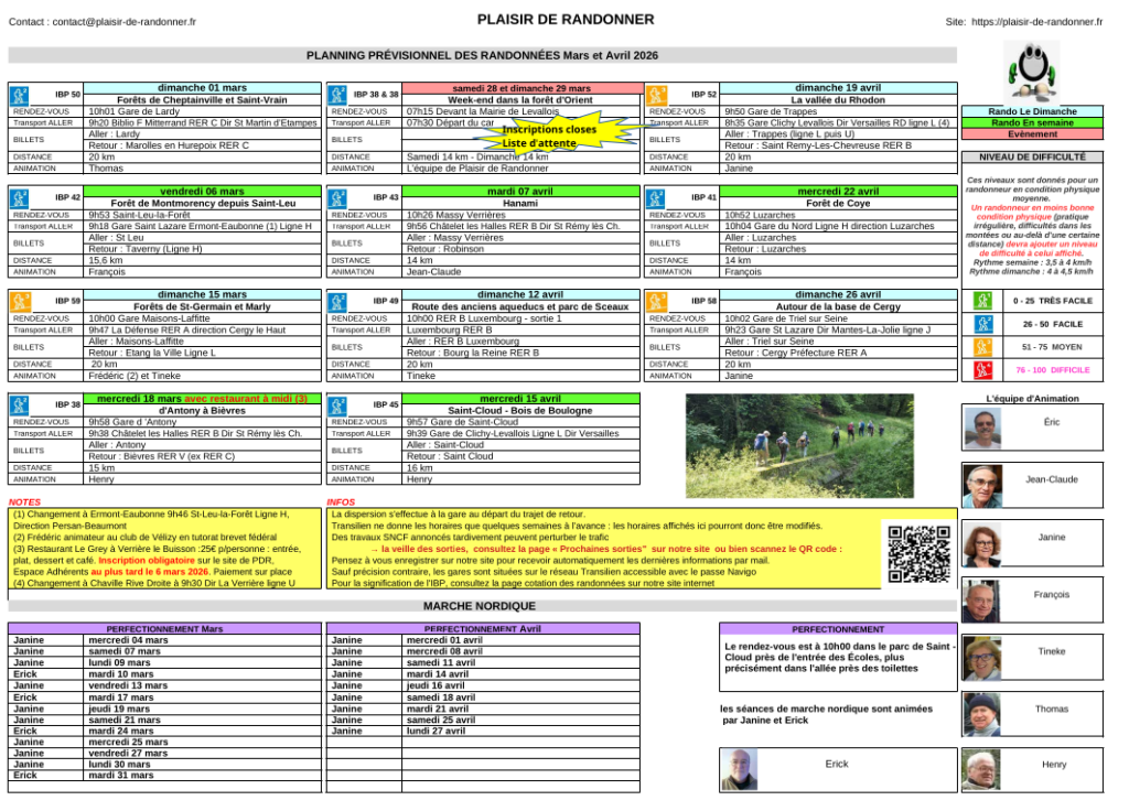 Nous organisons, en Île-de-France, des randonnées en moyenne 3 dimanches par mois et trois fois par mois en semaine.