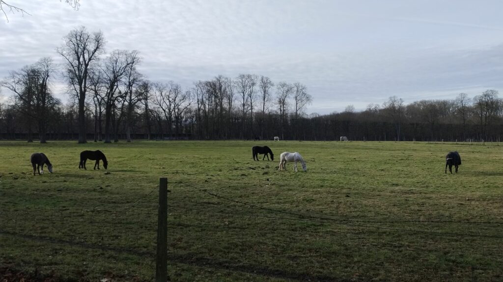 Nous traversons la Plaine de la Fontaine aux Crapauds en admirant des chevaux dans les champs,