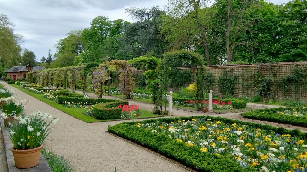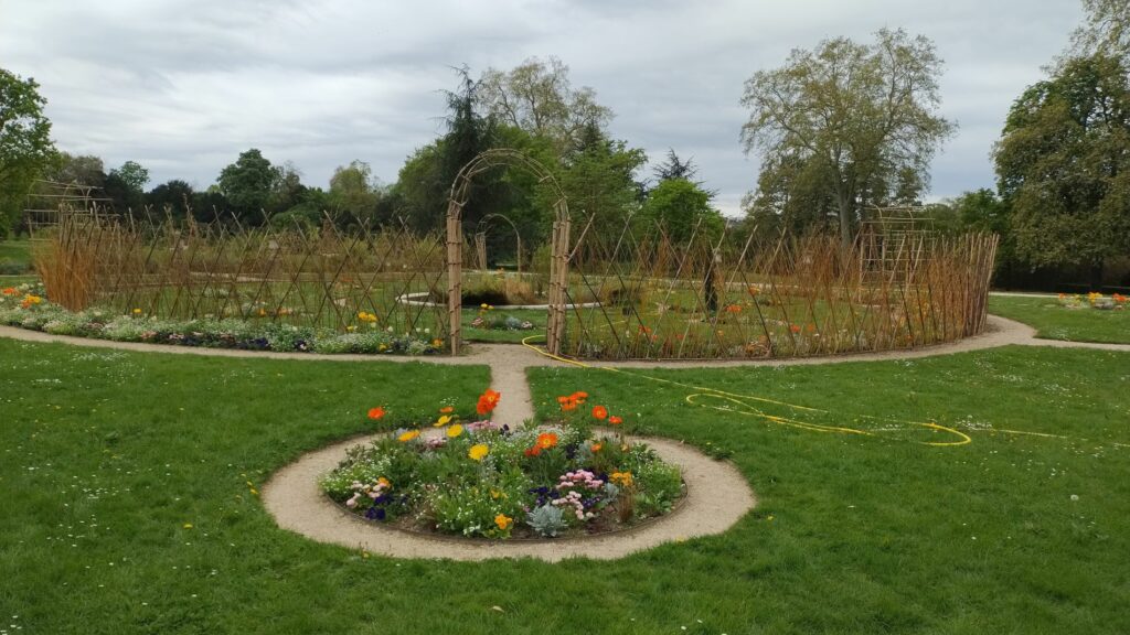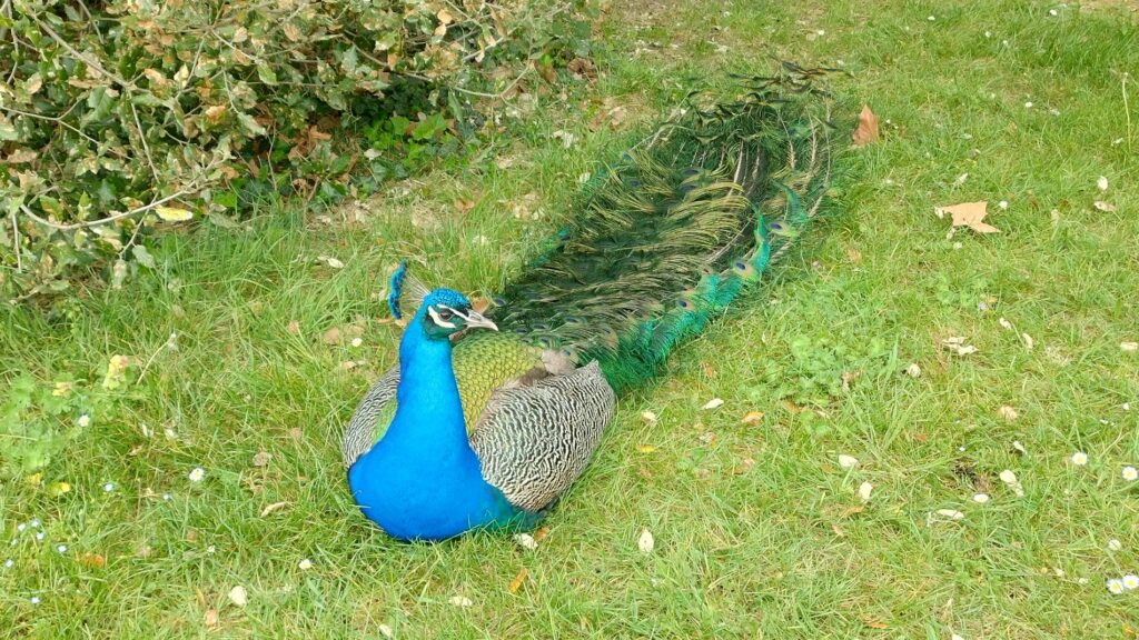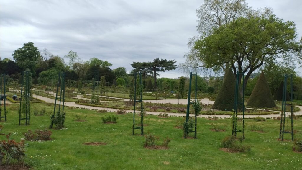 Nous poursuivons vers le Parc de Bagatelle (qui est payant du 1er avril au 1er octobre), montons au belvédère qui offre une vue sur la Défense (lorsque les arbres n’ont plus de feuilles !) et admirons les parterres de fleurs et un superbe paon qui n’a pas voulu faire la roue malgré les demandes insistantes de Gisèle (la photo est belle quand même). Par contre il faudra revenir plus tard pour voir la roseraie en fleur.