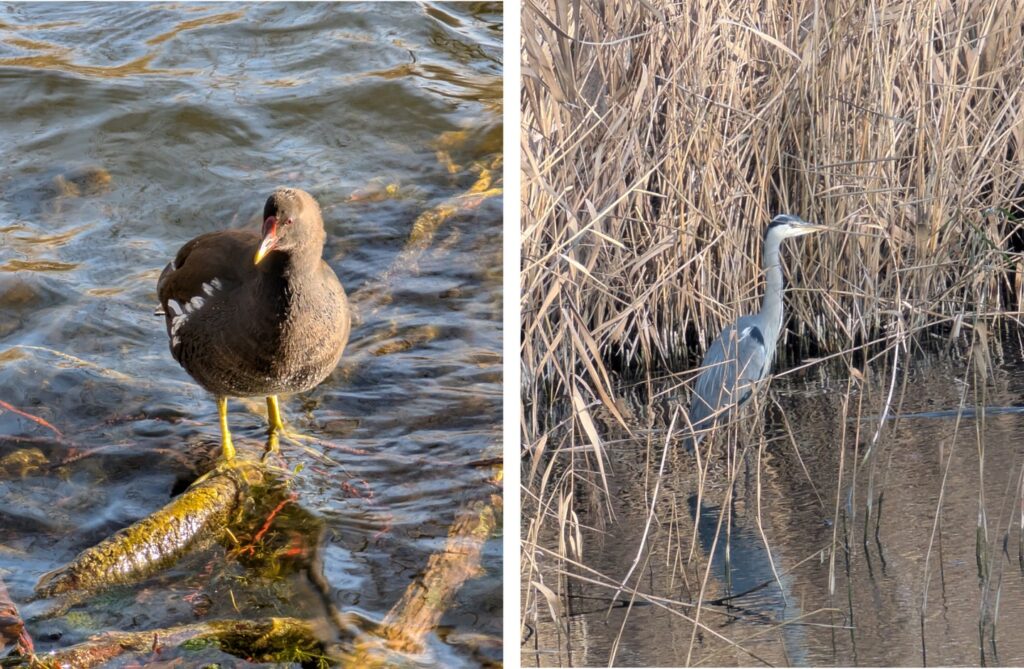 Avec le soleil, les oiseaux sont de sortie également. Nous en admirons deux sur l’étang.