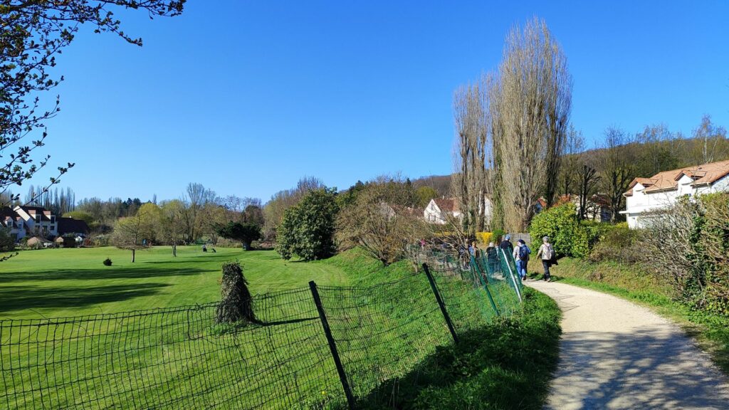 Nous passons non loin de la gare de Massy-Verrières et trois randonneuses avec des obligations, en profitent pour nous quitter. Nous continuons à longer la Bièvre en traversant une zone de grand ensembles immobiliers le long de la D60 et rejoignons le sentier Maurice et Alain Victor-Marchand (GR11), puis le golf de Verrières-le-Buisson.