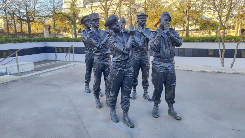Le parc s’étend jusqu’au « jardin noir, » où nous nous arrêtons devant le monument aux morts pour la France en opérations extérieures. Le monument représente 6 soldats anonymes portant un cercueil invisible.