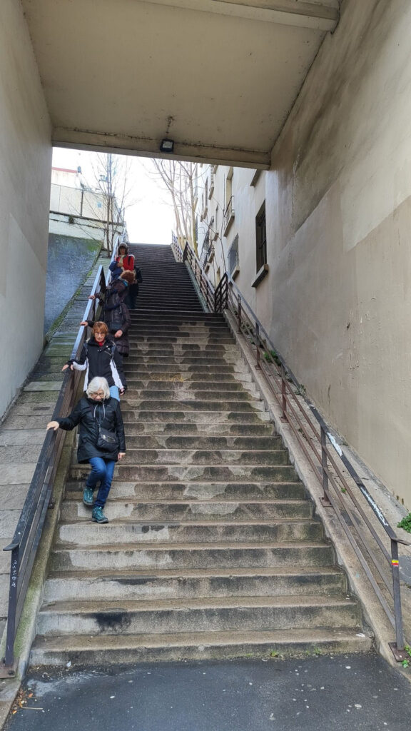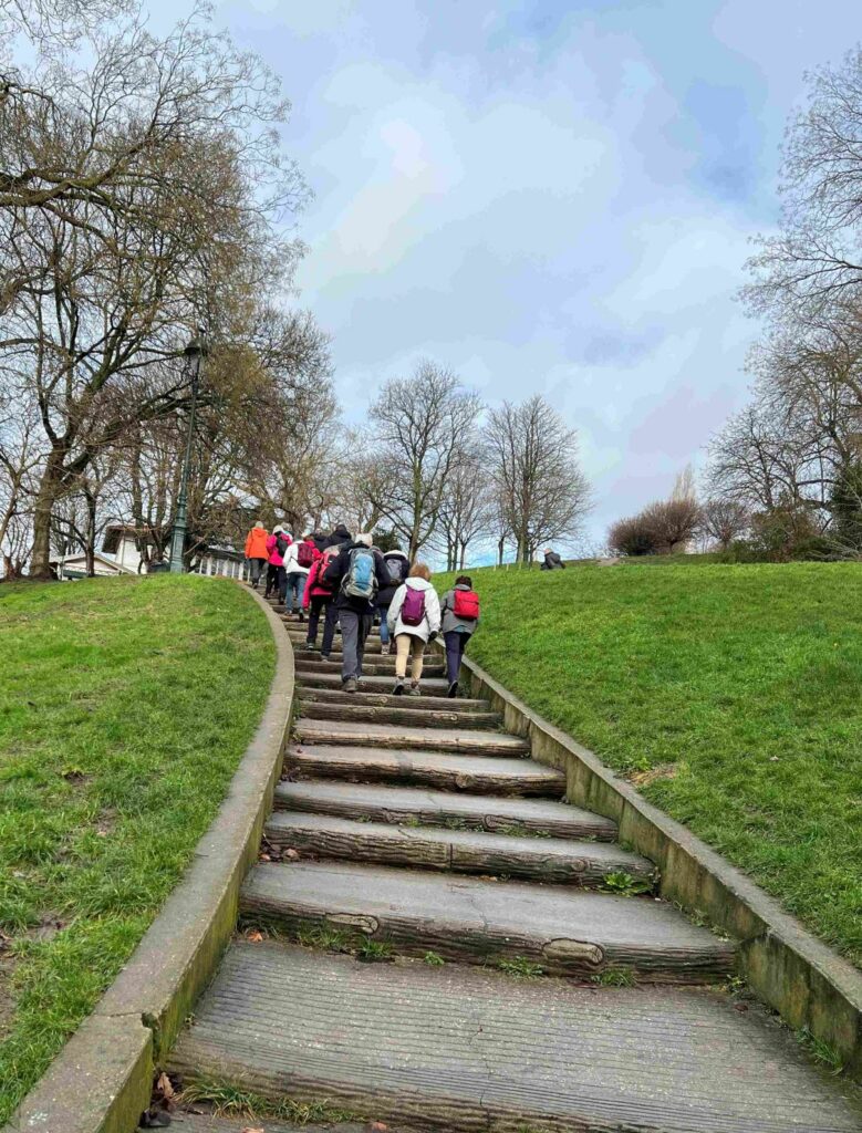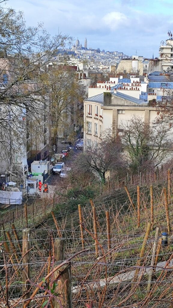 Nous sommes maintenant dans le 19ème arrondissement et nous passons par la butte Bergeyre après avoir montés plusieurs escaliers. Une belle vue panoramique s’offre à nous avec au loin la butte Montmartre et des vignes au premier plan. Après la montée, il y a bien sûr la descente.