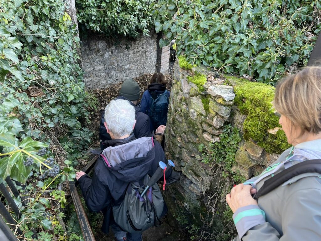 Poursuivant notre chemin, nous arrivons au pied d’une côte rendue bien glissante par les pluies des jours précédents. La grimpée est donc ardue et les bâtons recommandés par l’animateur s’avèrent bien utiles mais certaines préfèrent d’autres moyens pour gravir la pente. Cela n’empêchera pas la première chute, heureusement sans gravité, de la journée.