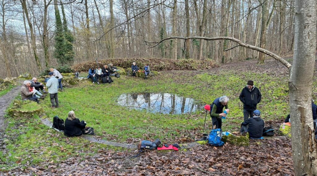 C’est à 13h, et après 10 kms de marche, que nous arrêtons enfin pour déjeuner dans une clairière ensoleillée sur les margelles d’un ancien bassin.