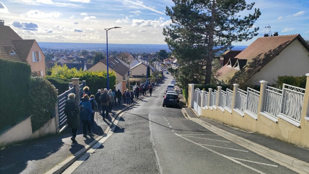 Sortis de la gare de Cormeilles-en Parisis, nous amorçons notre montée en pente douce vers la « Montagne » de Cormeilles en suivant une rue commerçante plutôt animée en ce jour de marché.