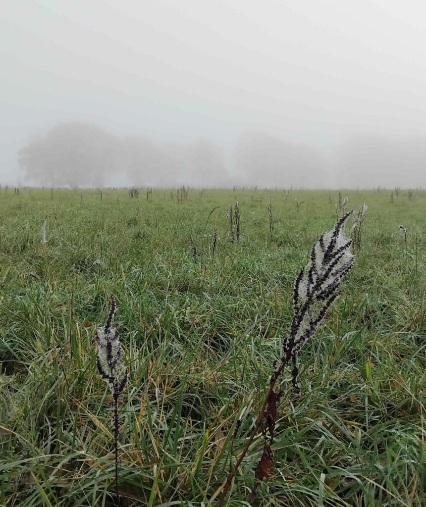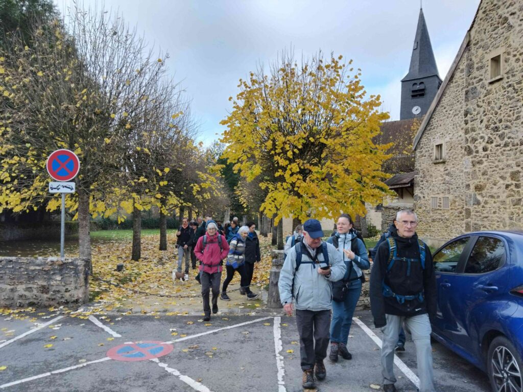 1. Ce dimanche là, le haut de la Tour Montparnasse était dans le brouillard, ce qui présageait une brume plus tenace en campagne. Effectivement, une vapeur de brume a enveloppé notre parcours. Un voile irréel était suspendu au-dessus des champs et des forêts. Nous avons admiré les feuillages roux et or, les moelleux tapis de feuilles et les toiles d’araignées d’une grande finesse. A n’en pas douter, le décor était planté pour Halloween. Une lumière intense et intermittente se dégageait des nuages pour laisser soudain apparaître des châteaux, des tourelles, une église, des mares et un lavoir. L’Essonne nous a livré les secrets de ses villages, parmi lesquels Boullay-les-Troux et ses 631 Boullaysiens ont gagné notre adhésion… grâce à PDR, à l’animateur du jour Thomas et aux 3 renforts musclés d’ Éric, de Tieneke et de François. Merci!!