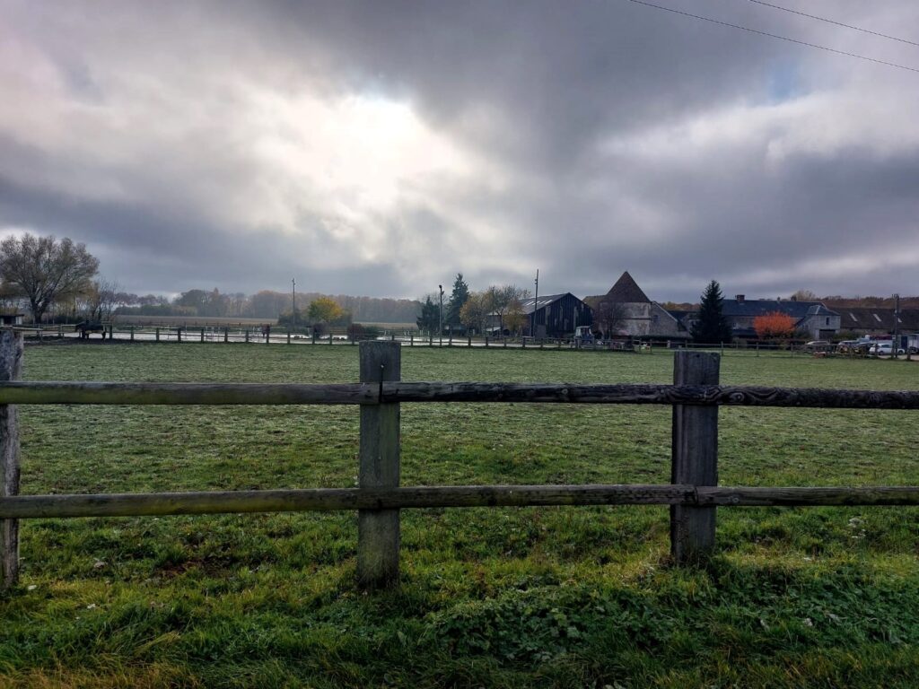 Après un bref coup d’œil à l’intérieur, nous repartons pour affronter une belle montée vers l’ancienne ferme fortifiée de Malvoisine, aujourd’hui un haras.